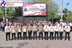 Beritainvestigasinews.id, Nganjuk - Kapolres Nganjuk AKBP Muhammad, S.H., S.I.K., M.Si, memimpin upacara kenaikan pangkat pengabdian 1 anggota Polres Nganjuk tingkat Perwira dan memberi Reward (Penghargaan) kepada 10 anggota yang berprestasi di lapangan apel Polres Nganjuk, Senin(7/8/2023) pagi.