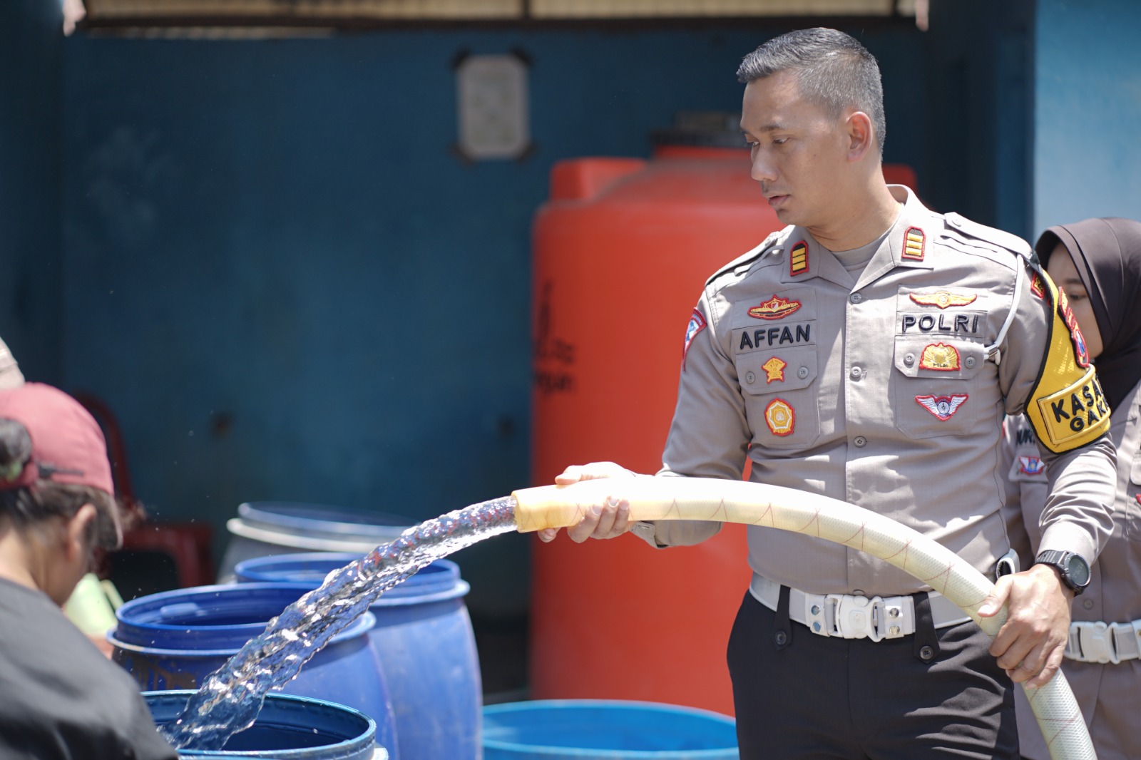 Selain droping air bersih, Satlantas Polres Ponorogo juga memberikan bantuan satu tandon air. Hal itu dilakukan karena tandon air milik warga tak mampu menampung tiga ribu liter air.