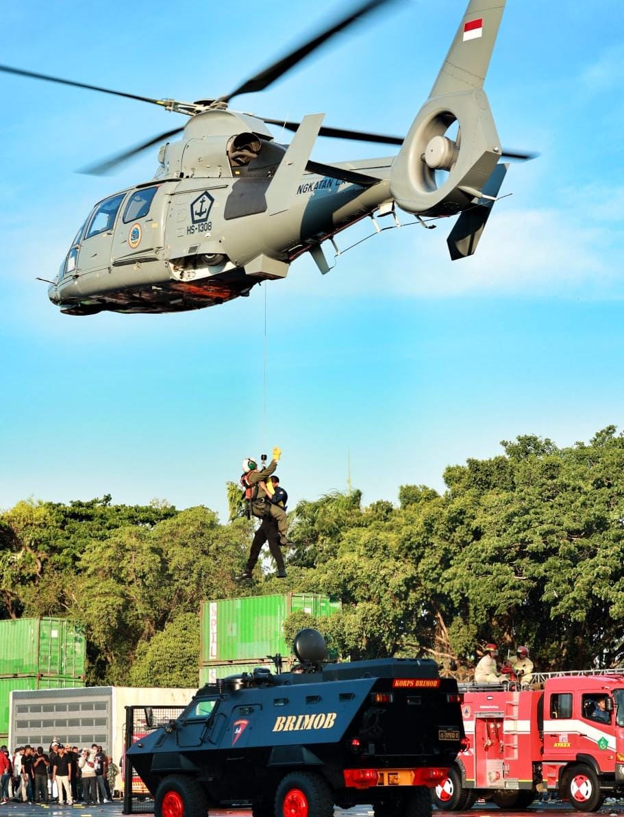 Ada juga scenario proses evakuasi dengan melibatkan Helikopter TNI AU dan AL serta aksi penyelematan Sandra dengan Teknik beladiri yang ditampilkan oleh aparat TNI Polri serta petugas dari Pemprov Jatim.