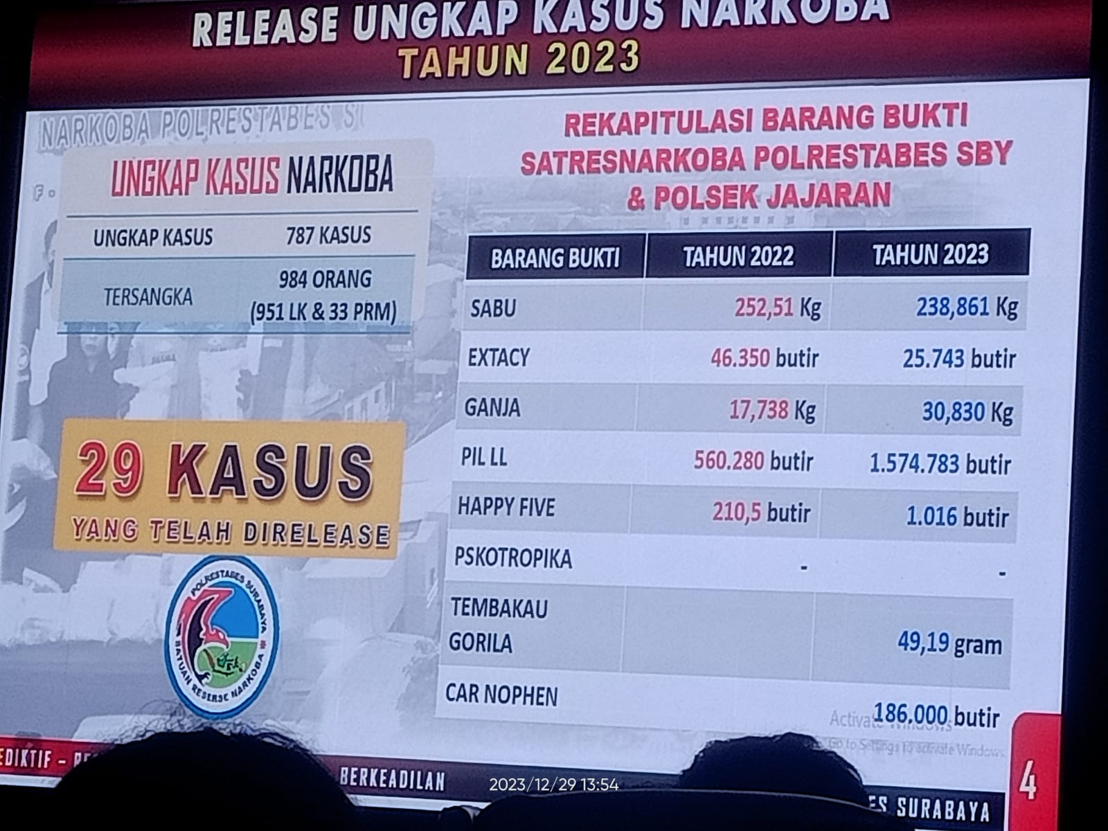 Kapolrestabes Surabaya juga memaparkan kepada awak media dalam giat tersebut, terkait Adanya kasus selama tahun 2023, pengungkapan kasus Narkoba sebanyak 787 kasus, dengan total tersangka sebanyak 984 orang, diantaranya ; 951 tersangka berjenis kelamin laki laki dan sebanyak 33 tersangka berjenis kelamin perempuan."Satresnarkoba berhasil mengamankan Narkoba jenis Sabu sebanyak 238.861 kg, Pil Extacy 25.743 butir, Ganja sebanyak 30.830 kg, Pil Double L sebanyak 1.574.783 butir, dan Happy Five sebanyak 1.016 butir." ujar Kapolrestabes Pasma.