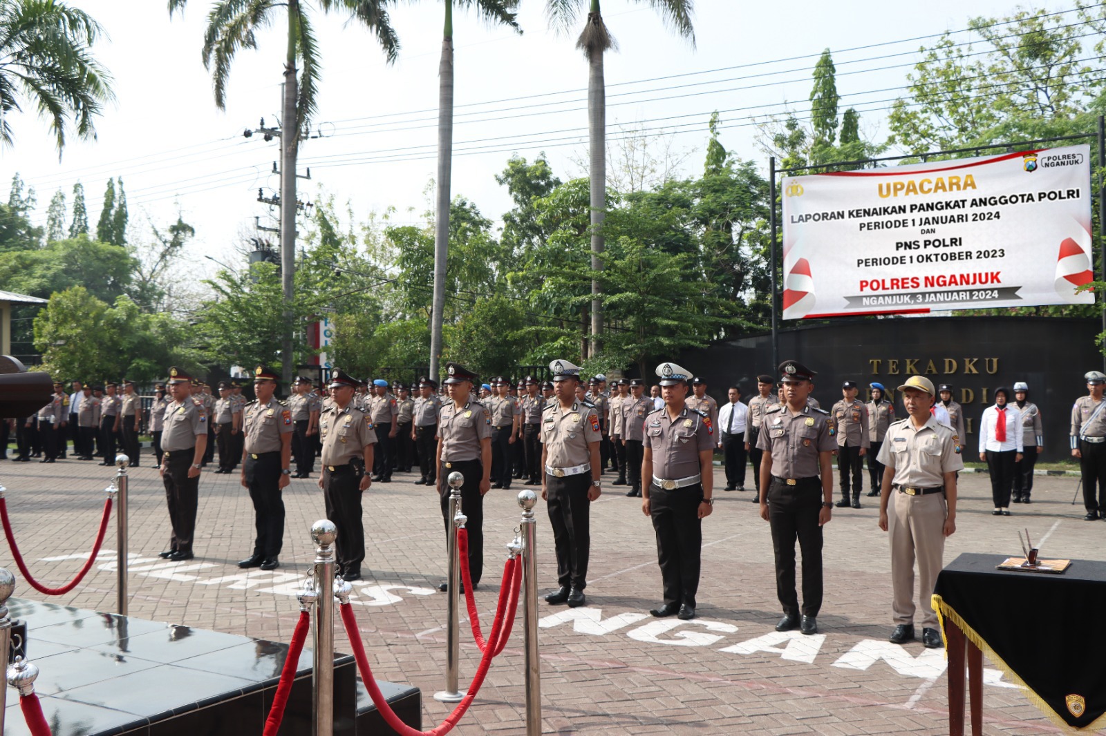 Beritainvestigasinews.id,Nganjuk - Kapolres Nganjuk, AKBP Muhammad, S.H., S.I.K., M.Si., memimpin upacara Korp Raport Kenaikan Pangkat 93 Anggota Polri dan ASN satu tingkat lebih tinggi periode 1 Januari 2024.Upacara dilaksanakan di lapangan apel Polres Nganjuk, dihadiri oleh para Pejabat Utama (PJU), Kapolsek jajaran, anggota Polres Nganjuk dan Bhayangkari, Rabu (03/01/2024).
