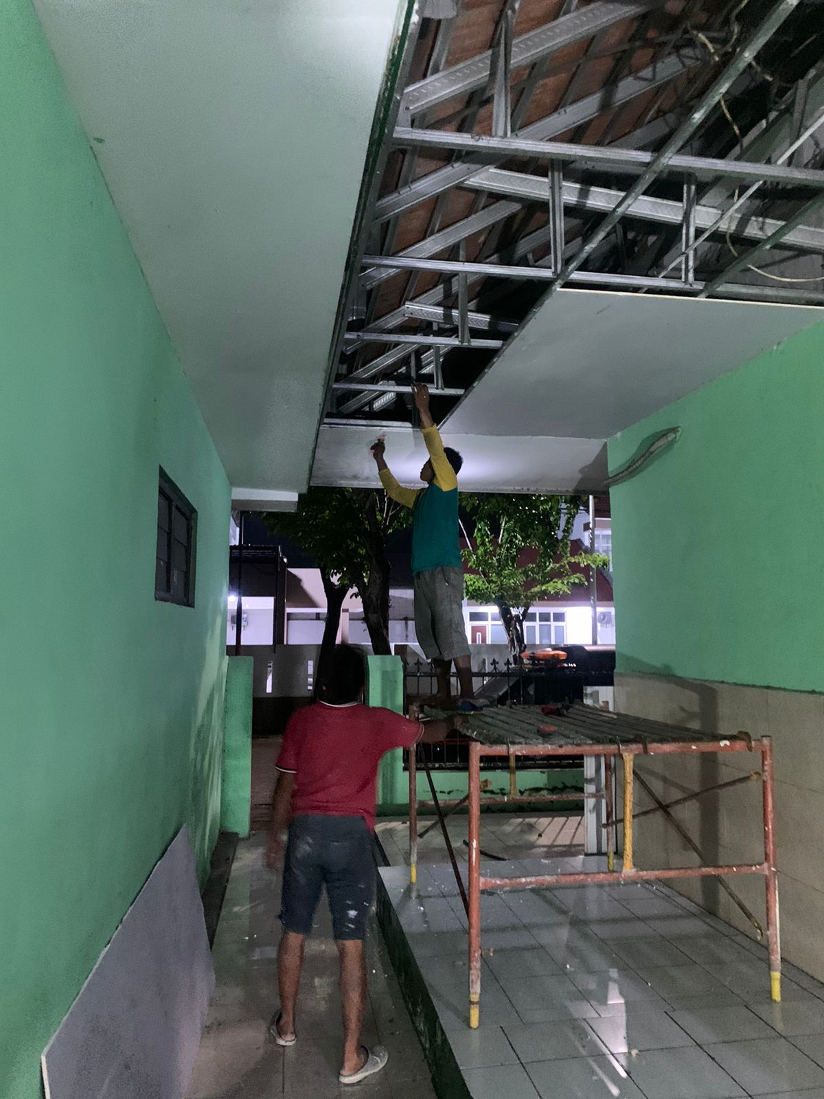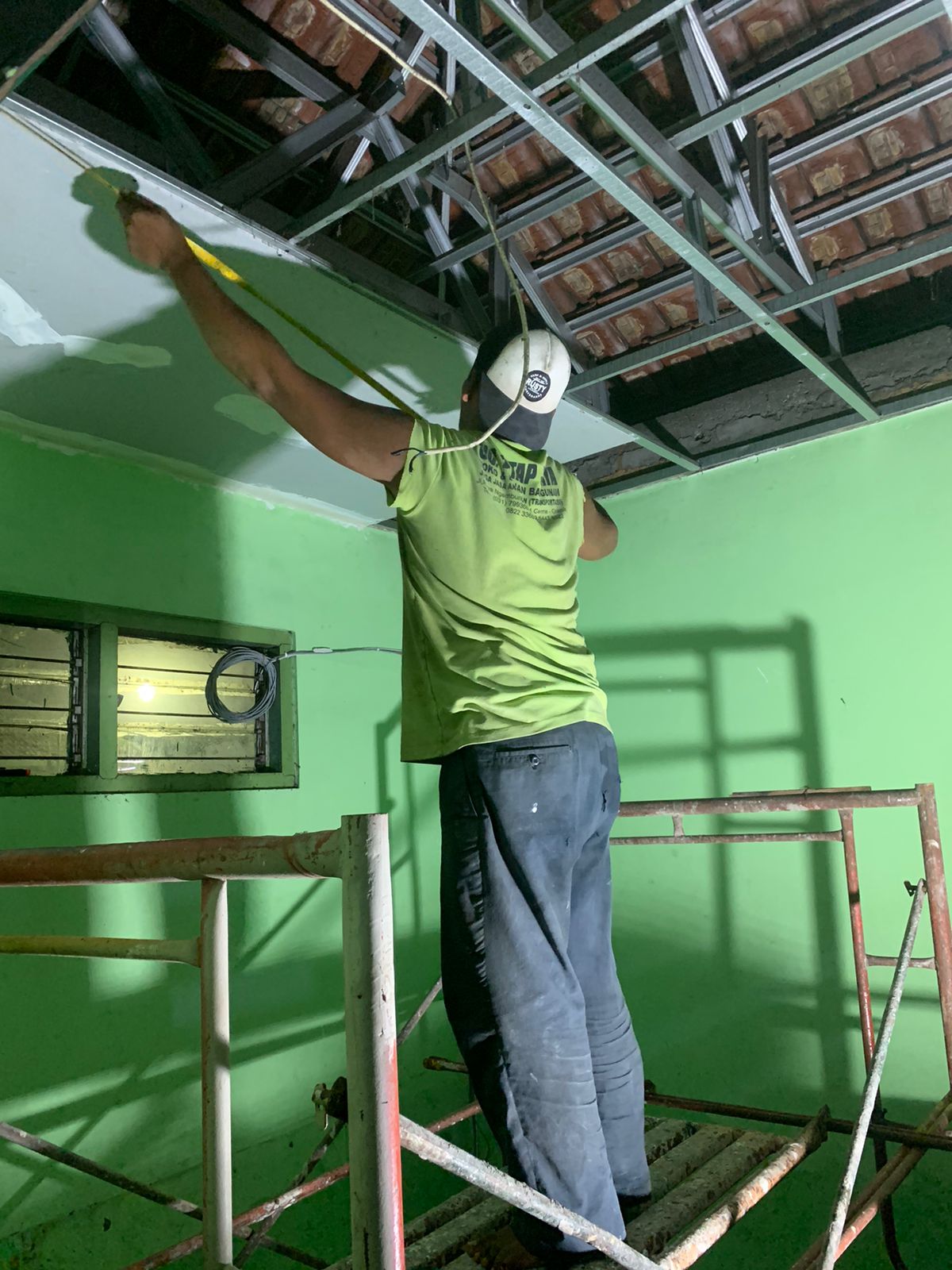 Hari ini kami sedang melakukan perbaikan di lokasi yang mengalami kerusakan diantaranya, plafon kamar mandi, kusen, lampu dan lain - lain.