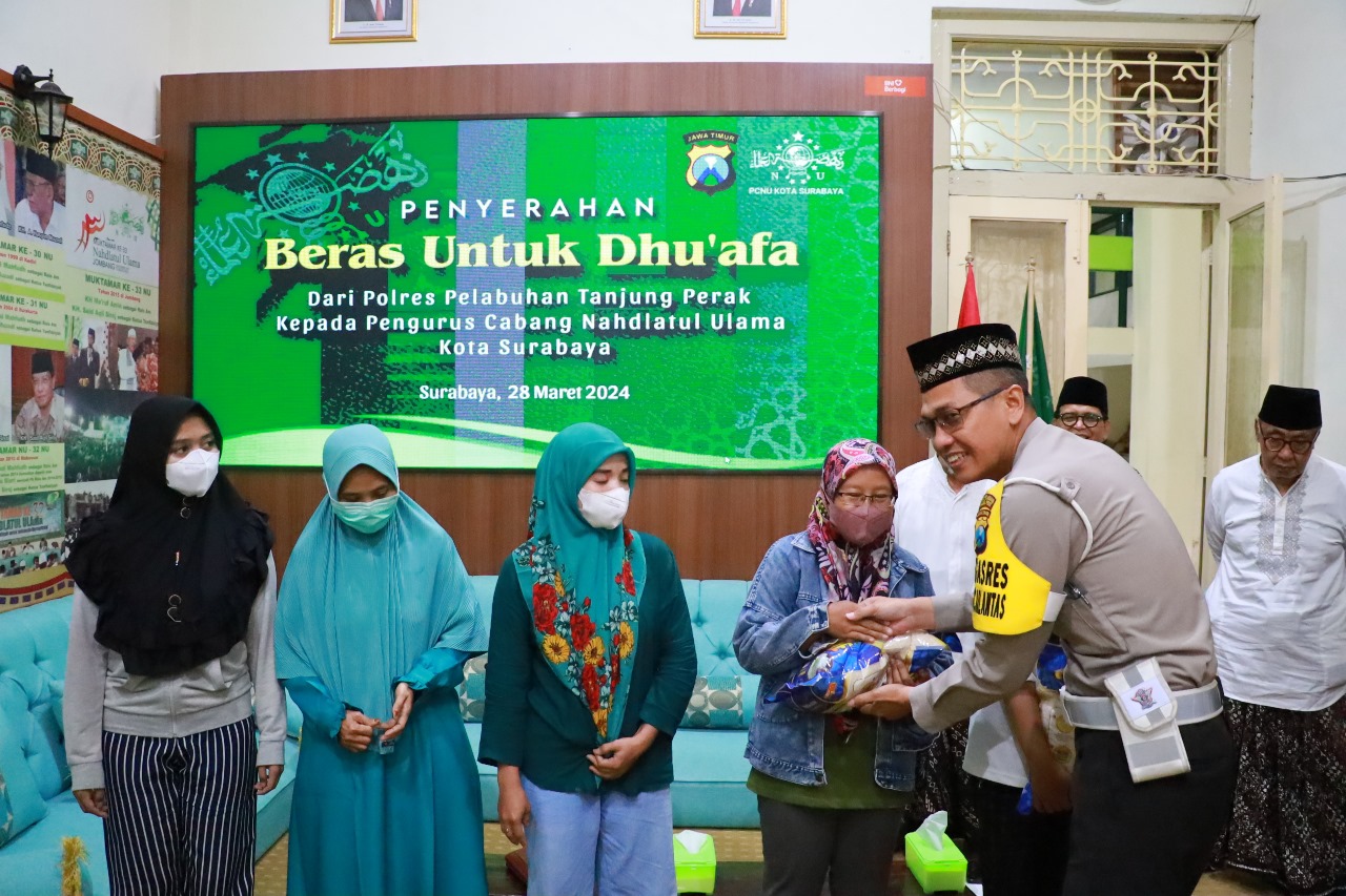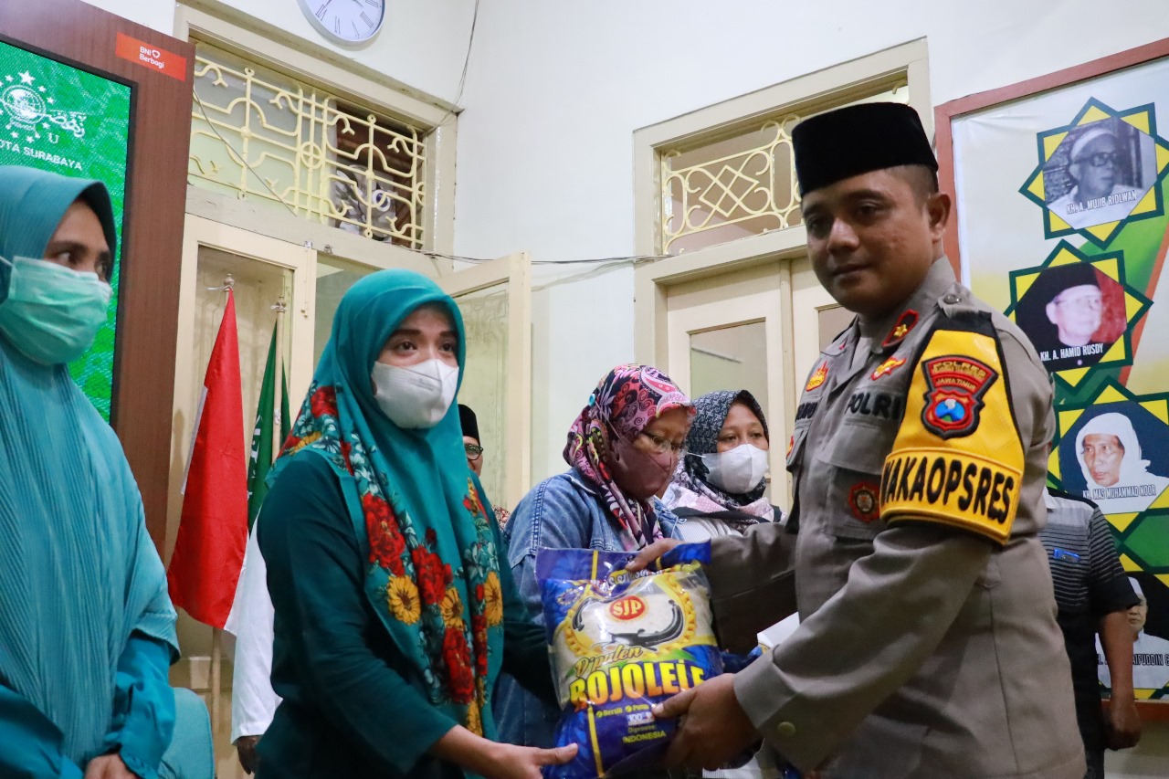 Dalam kunjungannya, Wakapolres Tanjung Perak Kompol Ari Bayuaji secara simbolis menyerahkan bantuan sosial (bansos) berupa paket sembako untuk para Dhu'afa melalui PCNU Kota Surabaya.