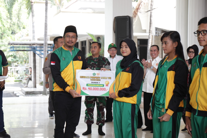 Bupati Sidoarjo Ahmad Muhdlor Ali secara simbolis menyerahkan bonus kepada atlet perwakilan cabor yang berhasil mencetak prestasinya dan juga kepada pelatih atas kerja kerasnya dalam melatih atlet hingga meraih perolehan point yang membanggakan.