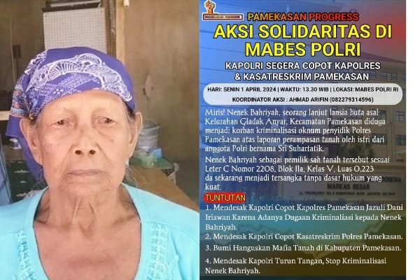 Beritainvestigasinews.id, Pamekasan, - Buntut kemelut kasus tanah yang menjerat Bahriyah (71) nenek Lansia hingga menjadi tersangka atas laporan istri oknum Polisi, Pamekasan Progres akan menggelar aksi demonstrasi di Mabes Polri. Jumat, 29/03/2024.