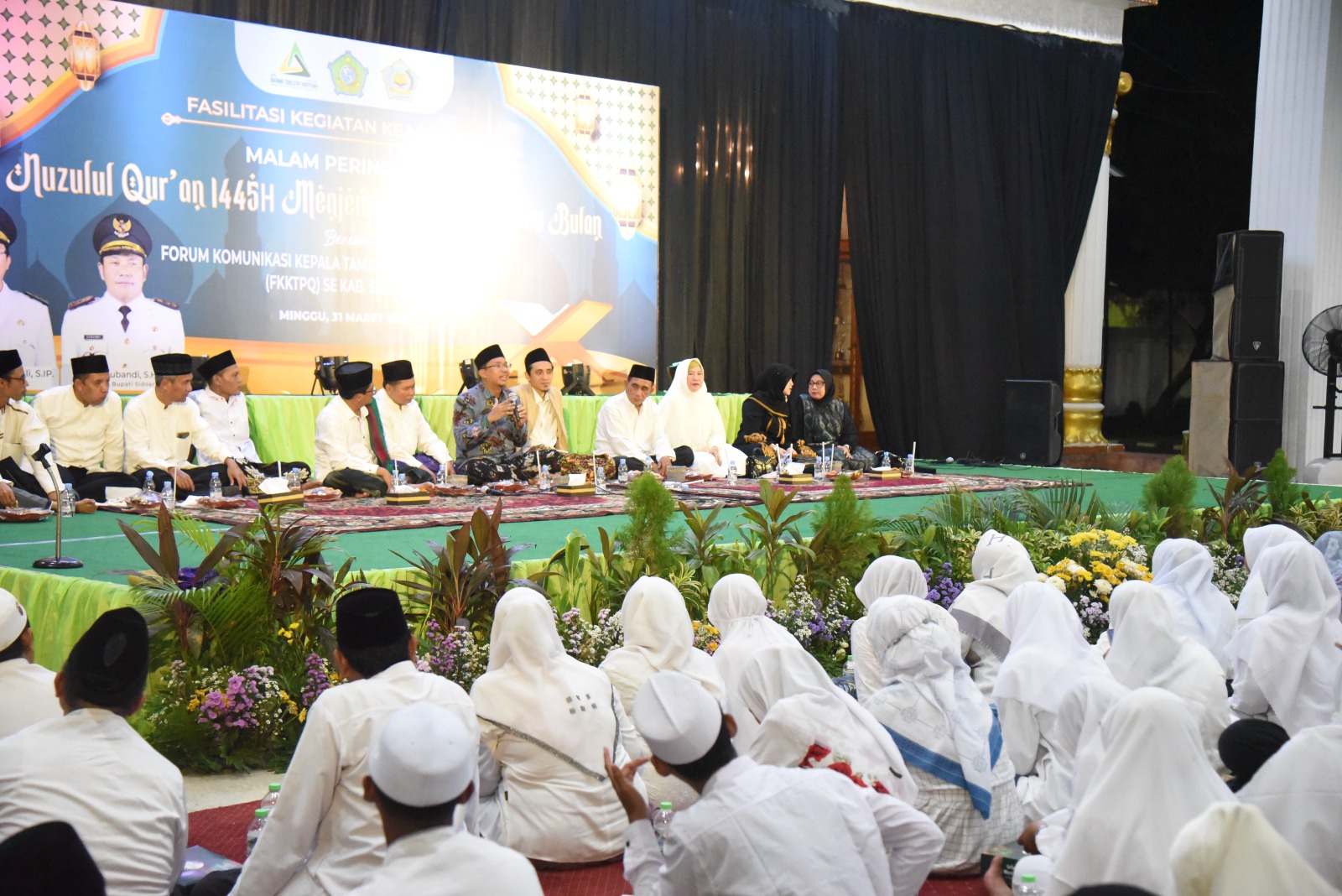 Beritainvestigasinews.id, Sidoarjo, - Pemkab Sidoarjo fasilitasi Forum Komunikasi Kepala Taman Pendidikan Al-Quran (FKKTPQ) Kabupaten Sidoarjo menggelar peringatan malam Nuzulul Quran di pendopo Delta Wibawa, Minggu malam, (31/3/2024). Ribuan ustadz ustadzah se Kabupaten Sidoarjo yang tergabung dalam FKKTPQ Kabupaten Sidoarjo hadir dalam kegiatan tersebut. Doa tahlil dan bacaan surat Al-Ikhlas 100 kali dilantunkan oleh para pendidik agama tersebut. Bupati Sidoarjo H. Ahmad Muhdlor S.IP hadir ditengah-tengah mereka.