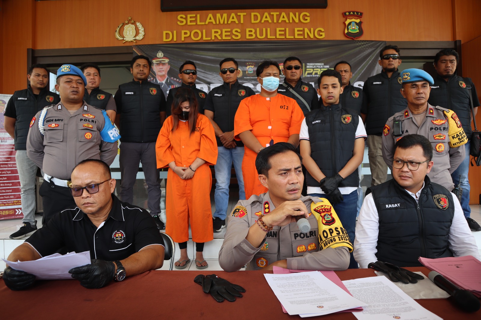 ||FOTO: Didampingi Kasat Reskrim dan Kasi Humas, Kapolres Buleleng AKBP Ida Bagus Widwan Sutadi, SIK, MH, beberkan pelaku dan barang bukti di depan media di lobi mapolres Buleleng.[/caption]