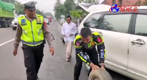 Tampak dua anggota Polantas saat melaksanakan patroli berhenti ketika melihat seorang pengendara yang mendapat masalah karena ban mobilnya bocor.