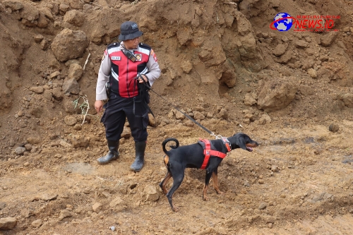 Pantauan di lokasi, tim K9 membawa kaos milik korban yang dibawa oleh pihak keluarga. Bahkan beberapa kali mengendus gundukan tanah longsor.