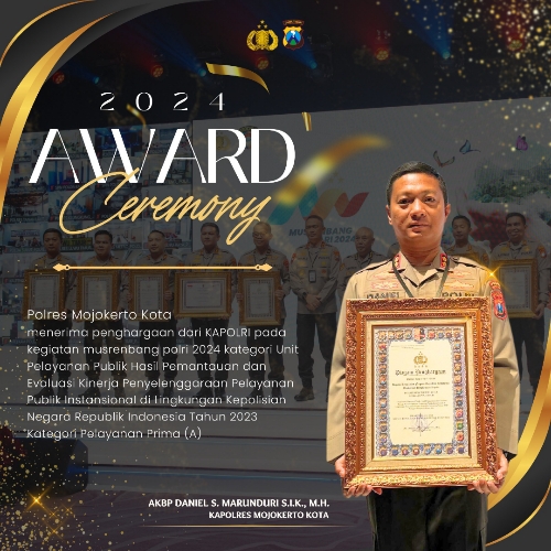 Beritainvestigasinews.id, Mojokerto Kota, - Dinilai baik dalam pelayanan di mal pelayanan publik (MPP) Tantya Sudhirajati dan di Satuan Penyelenggara Administrasi SIM (Satpas),Polres Mojokerto Kota Polda Jatim meraih penghargaan dari Kapolri,Jenderal Polisi Listyo Sigit Prabowo.