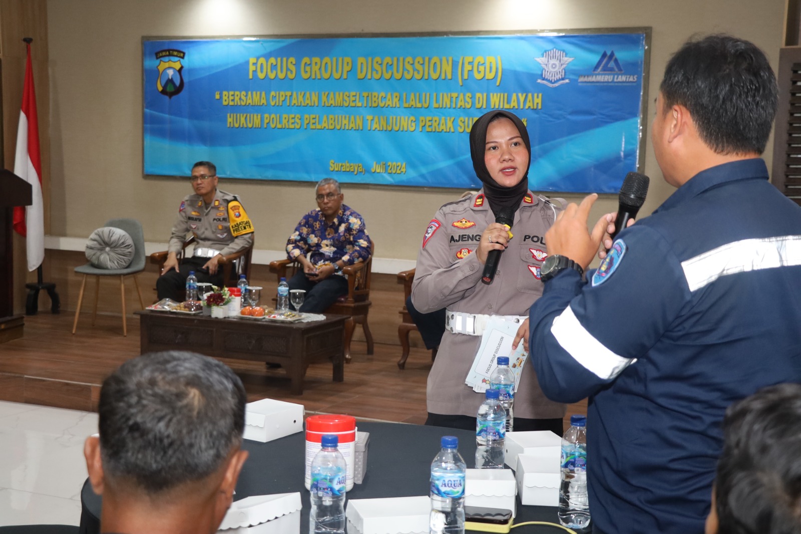 "Giat FGD dengan "Tema Bersama Ciptakan Kamseltibcar lalu lintas" berlangsung diruang Gedung Aula kantor Mapolres Pelabuhan Tanjung Perak Jalan Kalianget Nomor 01 Surabaya Kamis (25/07/2024).