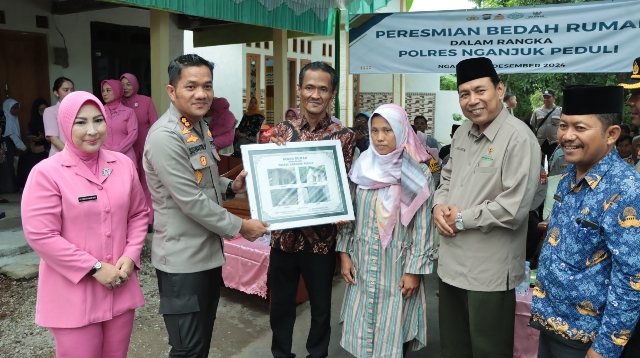 Beritainvestigasinews.id, Nganjuk, - Polres Nganjuk meresmikan rumah yang telah selesai dibedah dalam program Polres Nganjuk Peduli, Kegiatan yang berlangsung di Jl. Bengawan Solo V, Kelurahan Ringinanom, Kecamatan/Kabupaten Nganjuk, ini merupakan hasil kerja sama dengan Baznas Kabupaten Nganjuk, Selasa (17/12/2024).