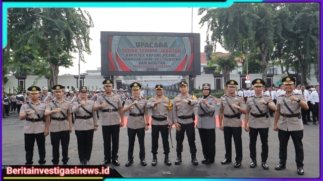 Beritainvestigasinews.id, Surabaya, Upacara serah terima jabatan yang berlangsung khidmat, Polrestabes Surabaya menyambut pejabat baru serta melepas pejabat lama dari jajaran Kapolsek. Acara ini juga menjadi momentum refleksi atas pencapaian kinerja kepolisian di wilayah hukum Polrestabes Surabaya, terutama dalam menjaga keamanan selama perayaan Natal dan Tahun Baru 2025.