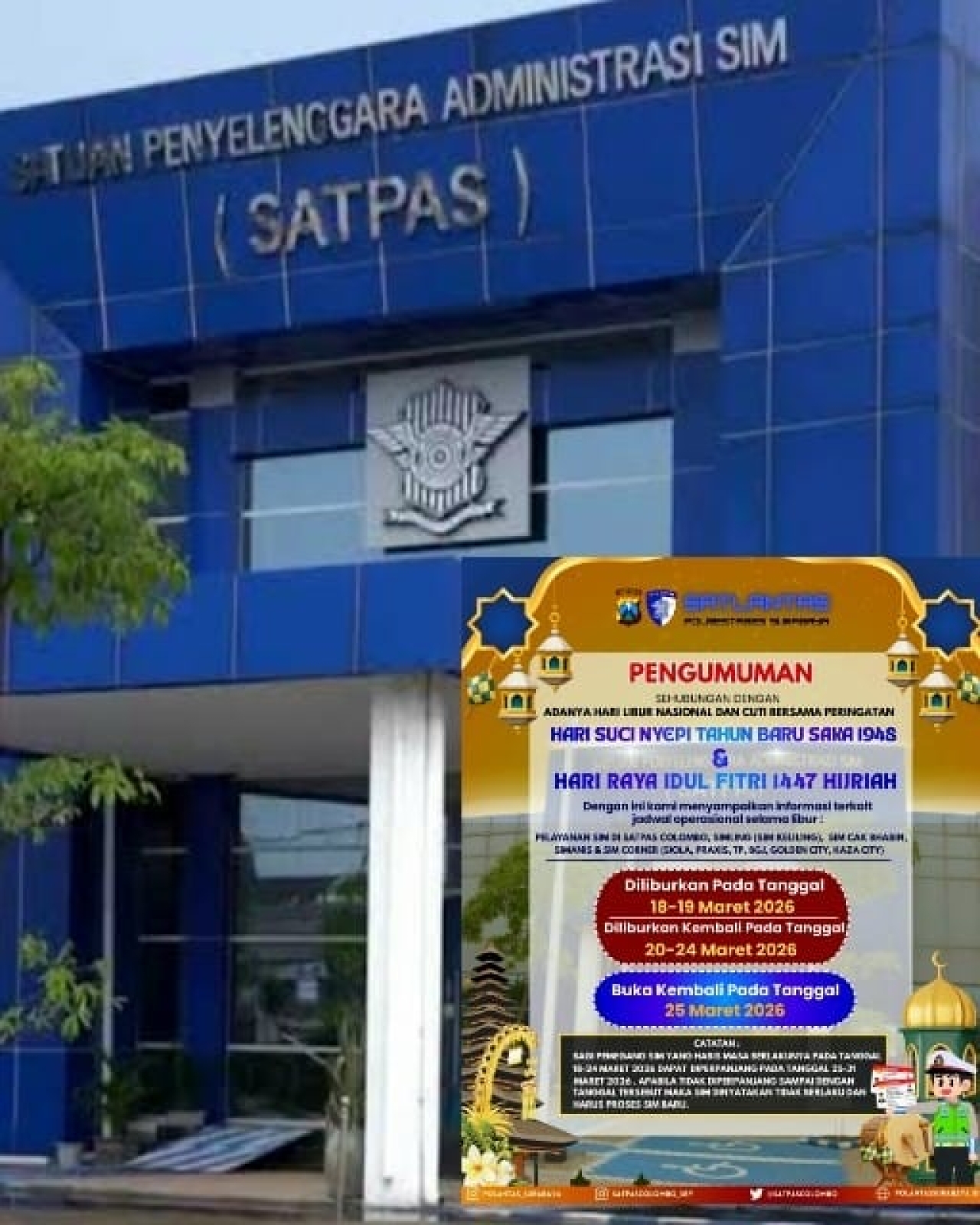 Beritainvestigasinews.id, Surabaya, - Satpas SIM Colombo Surabaya menghentikan sementara seluruh layanan pembuatan dan perpanjangan SIM bagi masyarakat. Penutupan operasional ini bertepatan dengan momen libur nasional Hari Raya Nyepi serta Idul Fitri 1447 Hijriah.